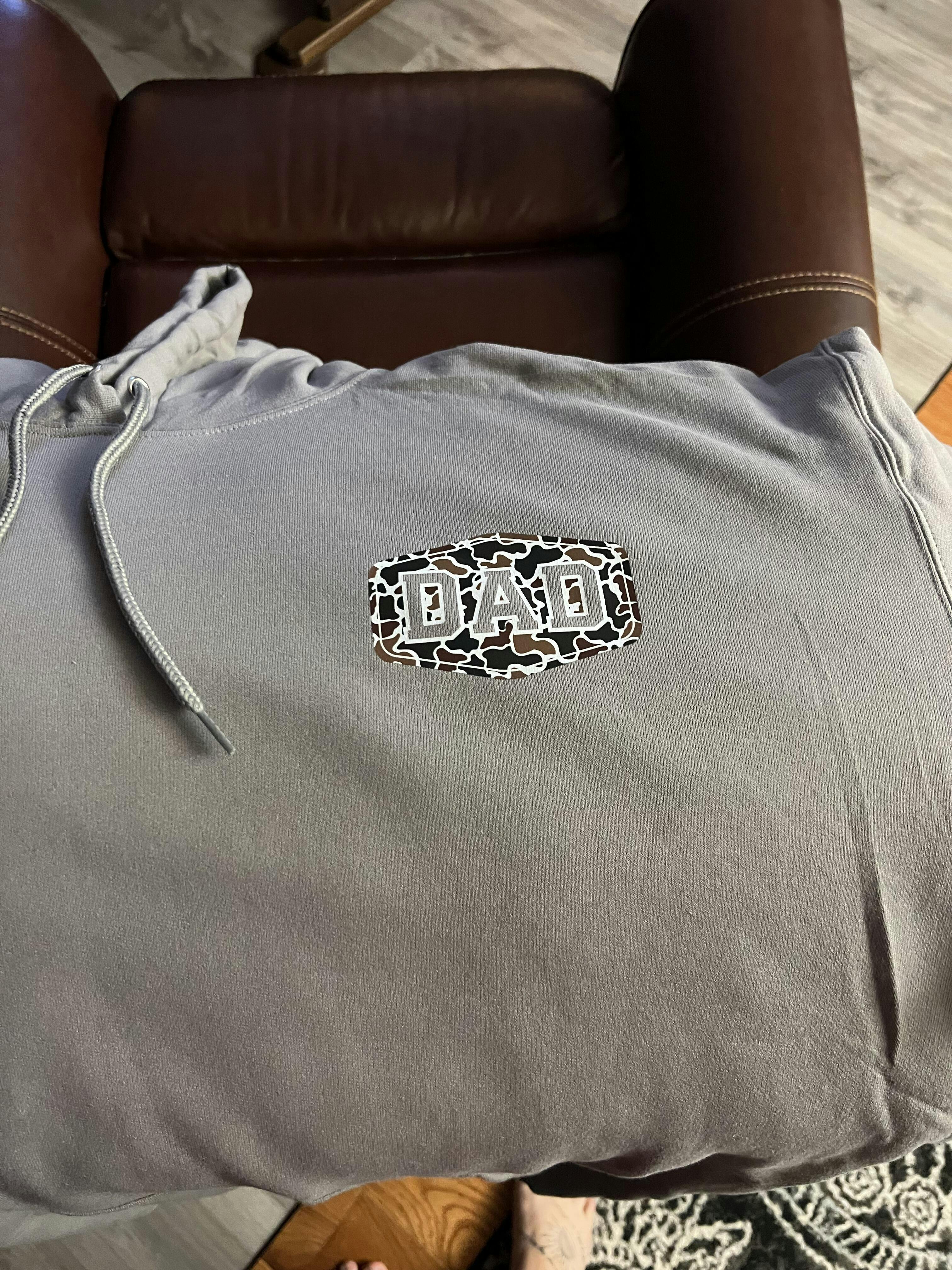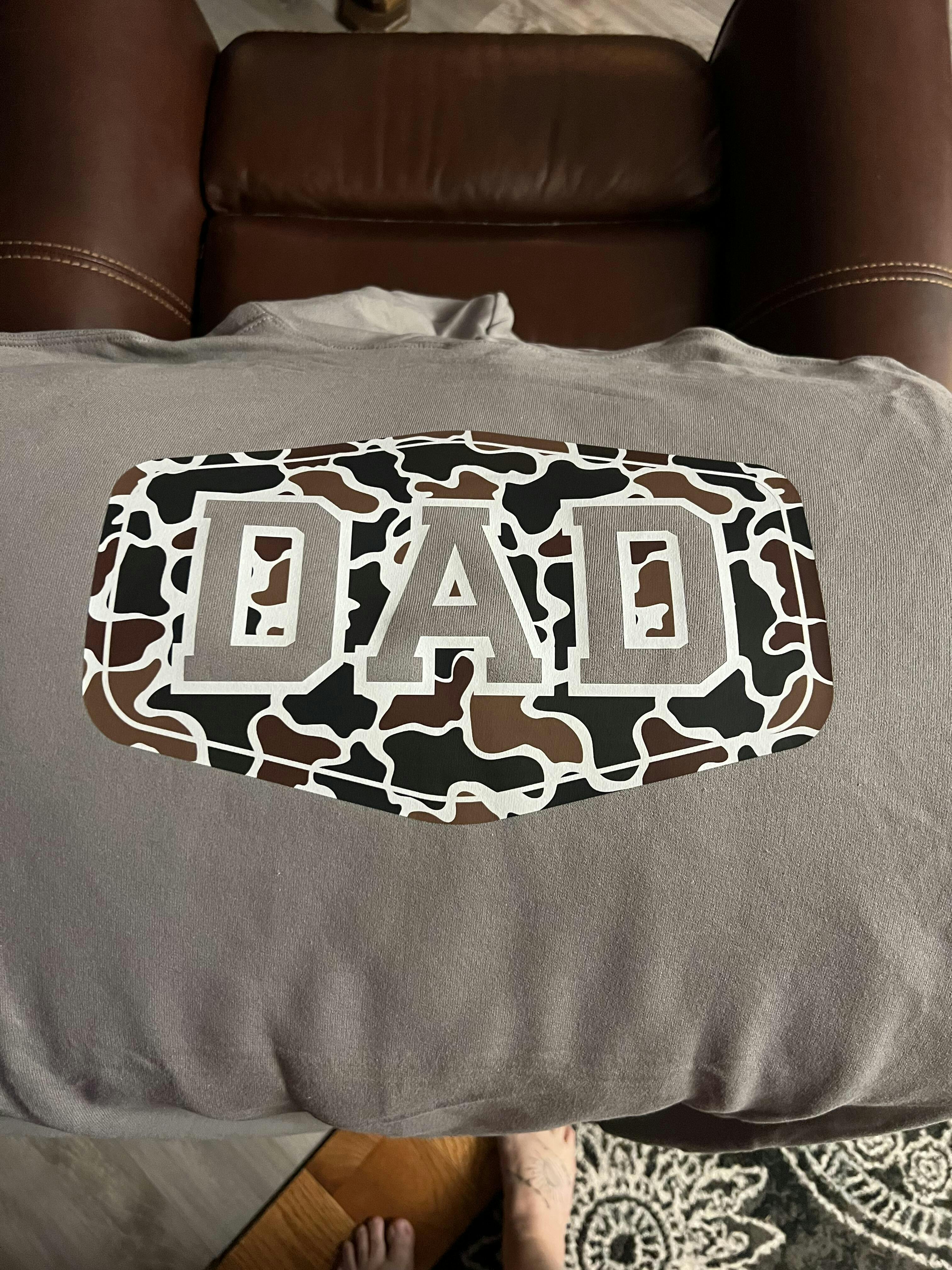 Camo Dad DTF This transfer is perfect for creating eye-catching piece and showing your style in a unique & whimsical way. High-quality, durable, and easy to apply, this transfer is ideal for DIY apparel projects.