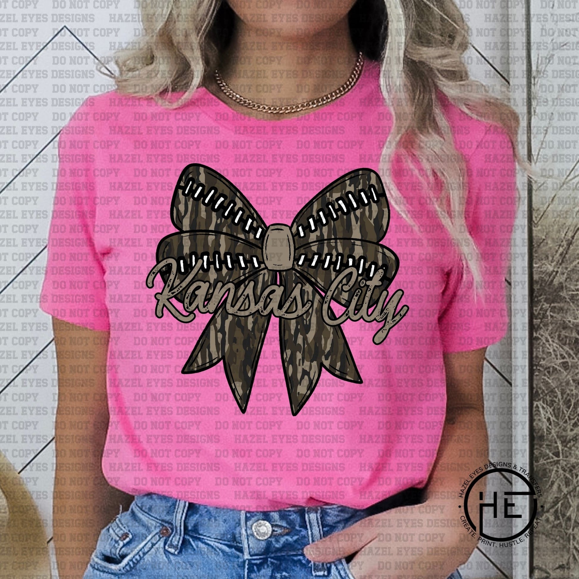 Camo KC Bow DTF This transfer is perfect for creating eye-catching piece and showing your style in a unique & whimsical way. High-quality, durable, and easy to apply, this transfer is ideal for DIY apparel projects.