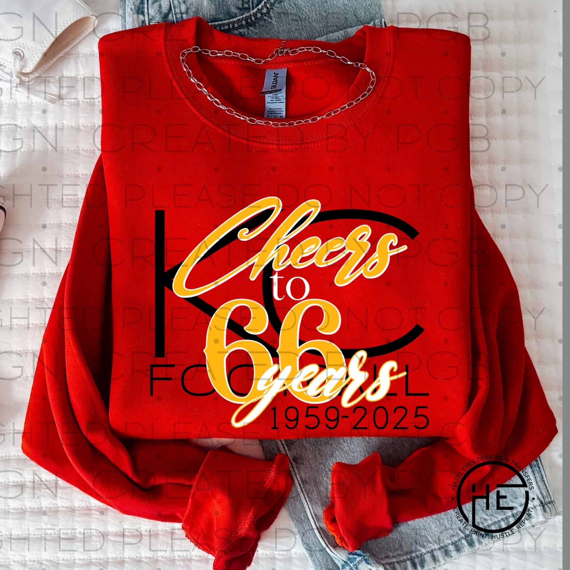 Cheers to 66 Years KC Football DTF This transfer is perfect for creating eye-catching piece and showing your style in a unique & whimsical way. High-quality, durable, and easy to apply, this transfer is ideal for DIY apparel projects.
