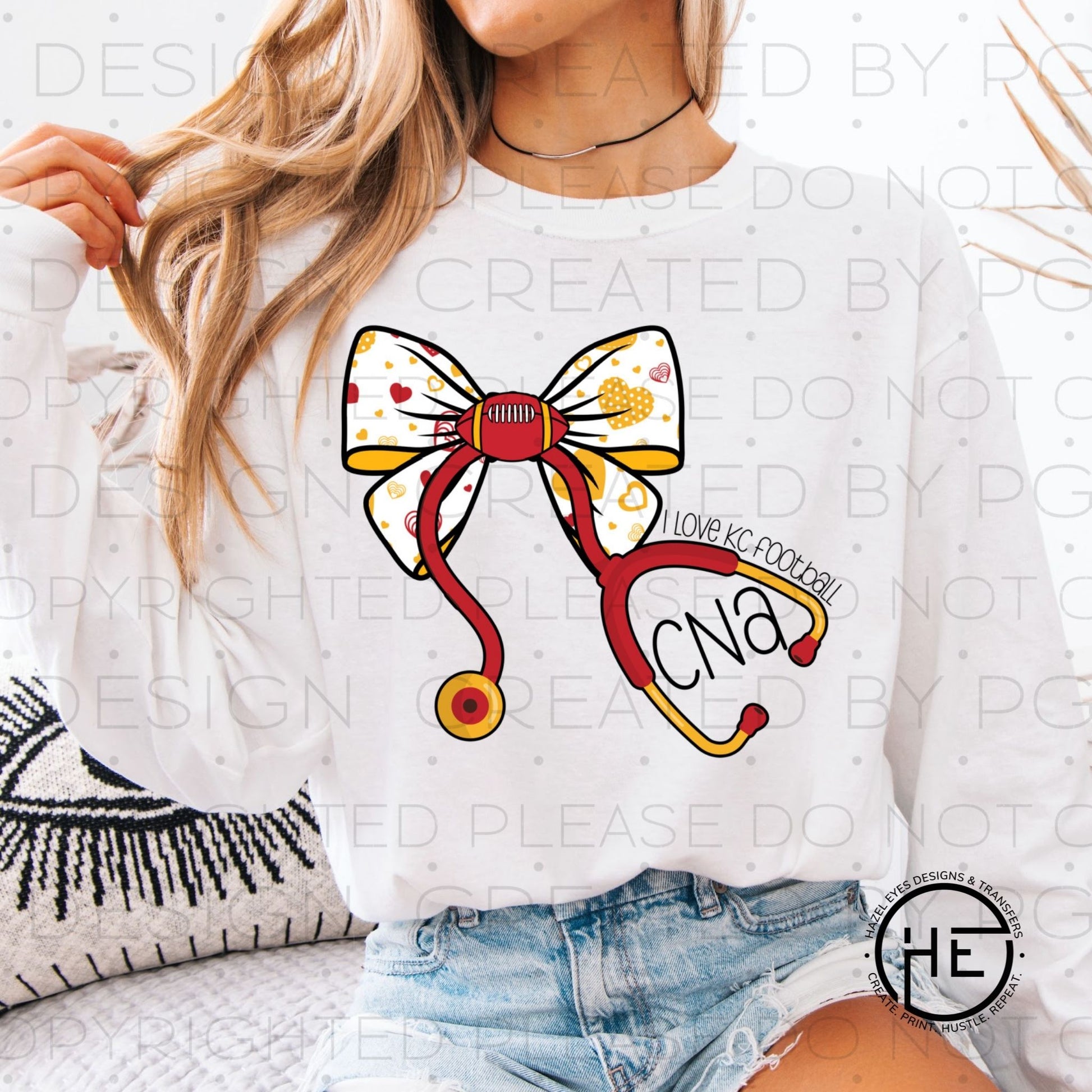 CNA KC Bow DTF This transfer is perfect for creating eye-catching piece and showing your style in a unique & whimsical way. High-quality, durable, and easy to apply, this transfer is ideal for DIY apparel projects.