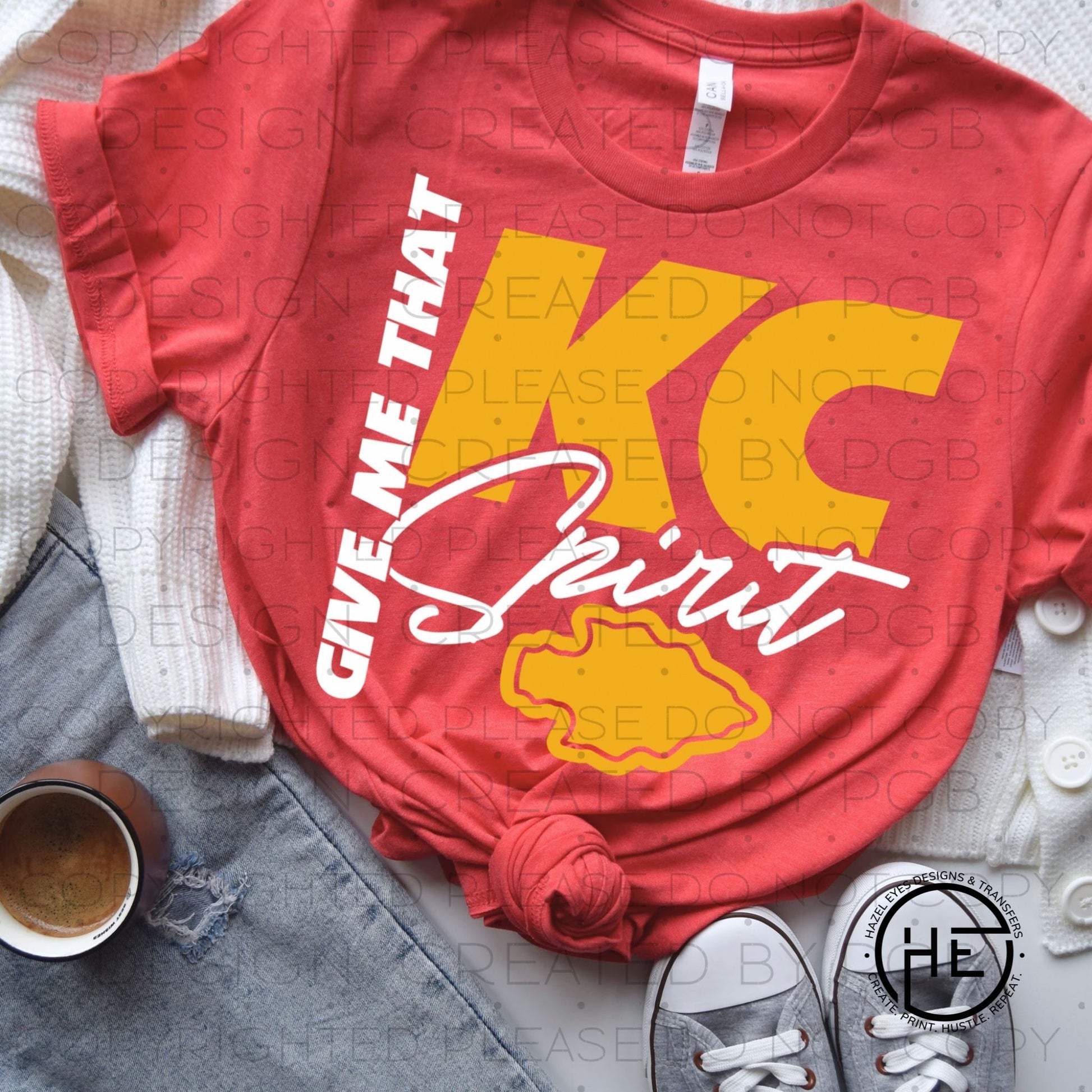 Give Me That KC Spirit DTF This transfer is perfect for creating eye-catching piece and showing your style in a unique & whimsical way. High-quality, durable, and easy to apply, this transfer is ideal for DIY apparel projects.
