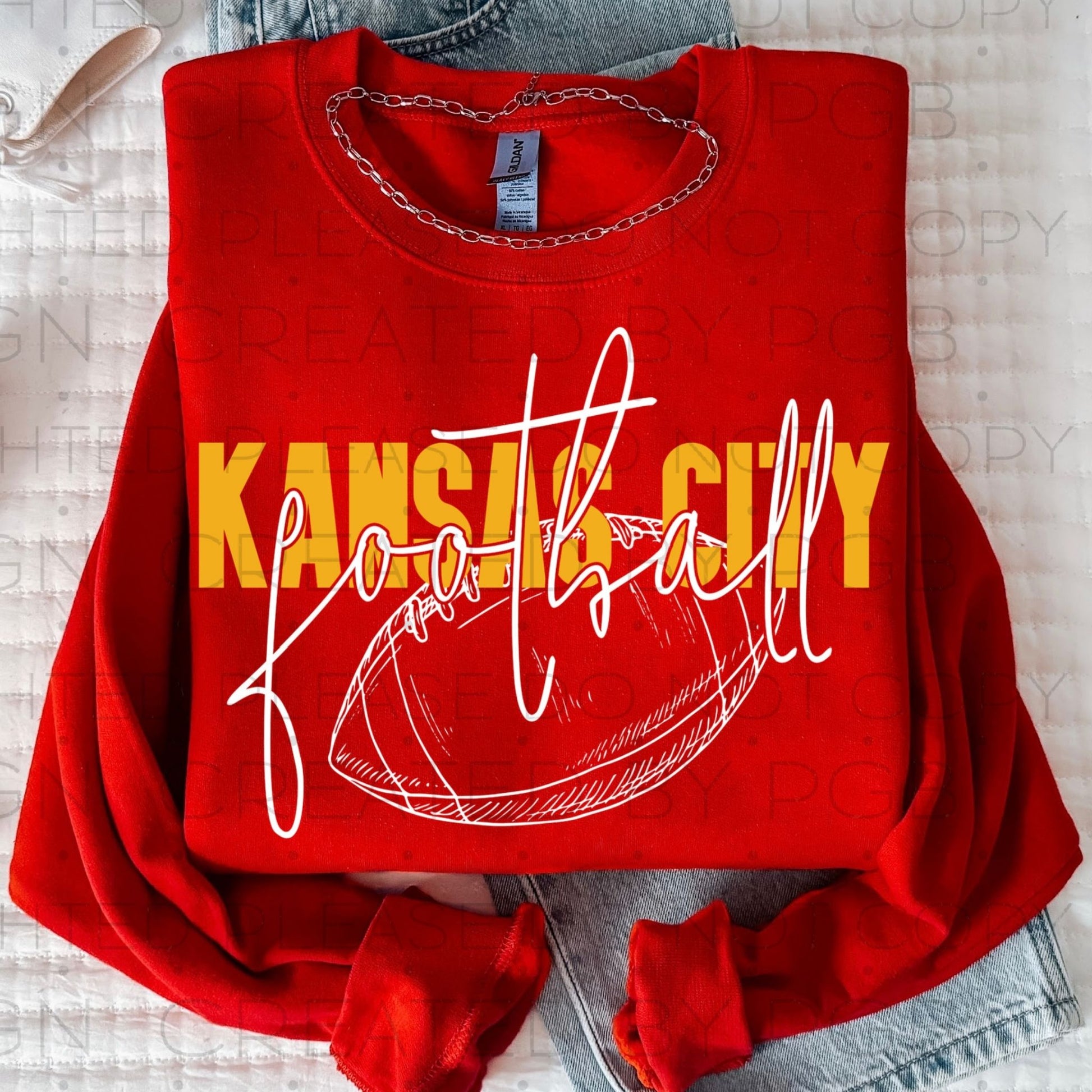 Kansas City Football DTF This transfer is perfect for creating eye-catching piece and showing your style in a unique & whimsical way. High-quality, durable, and easy to apply, this transfer is ideal for DIY apparel projects.