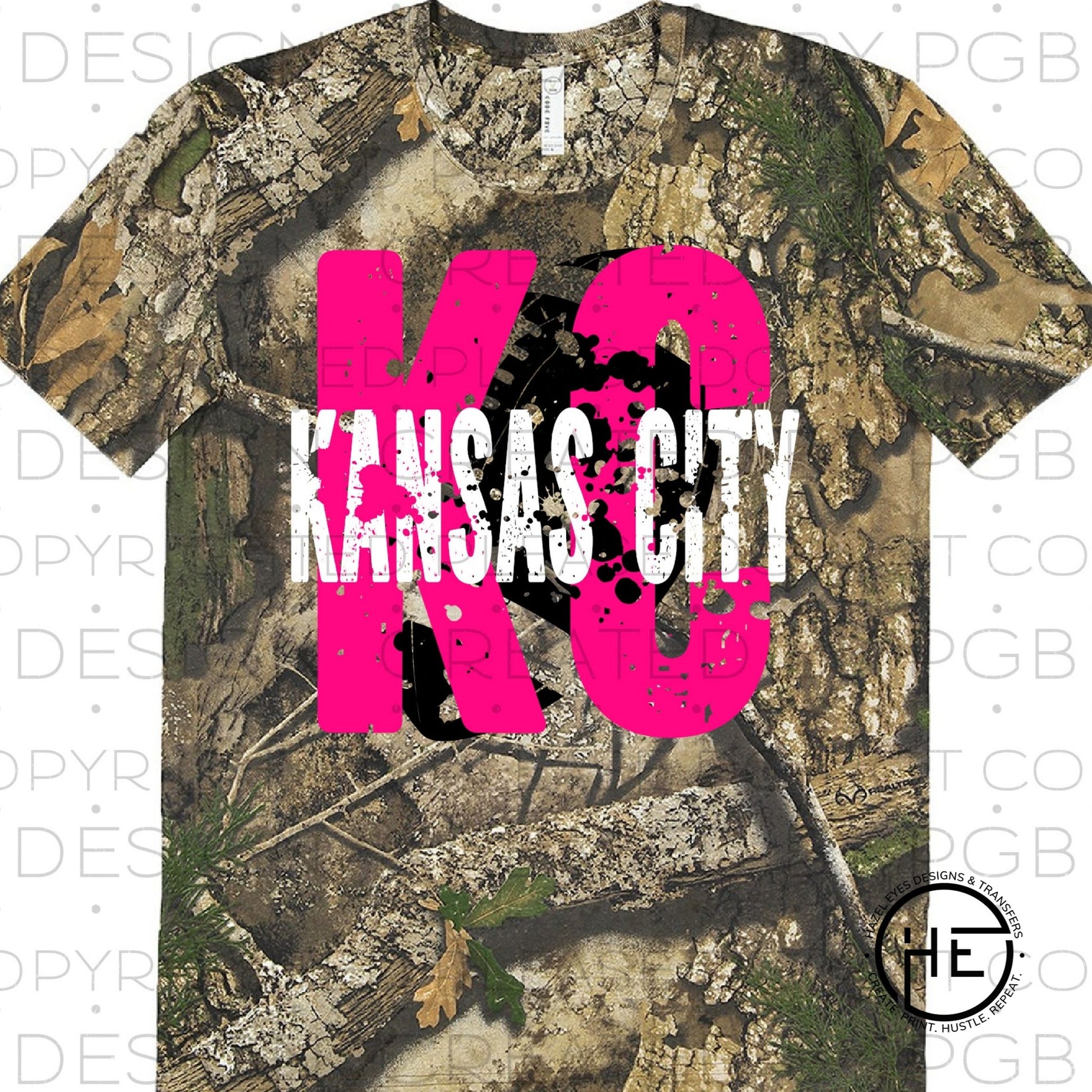 KC Pink Camo Football DTF This transfer is perfect for creating eye-catching piece and showing your style in a unique & whimsical way. High-quality, durable, and easy to apply, this transfer is ideal for DIY apparel projects.