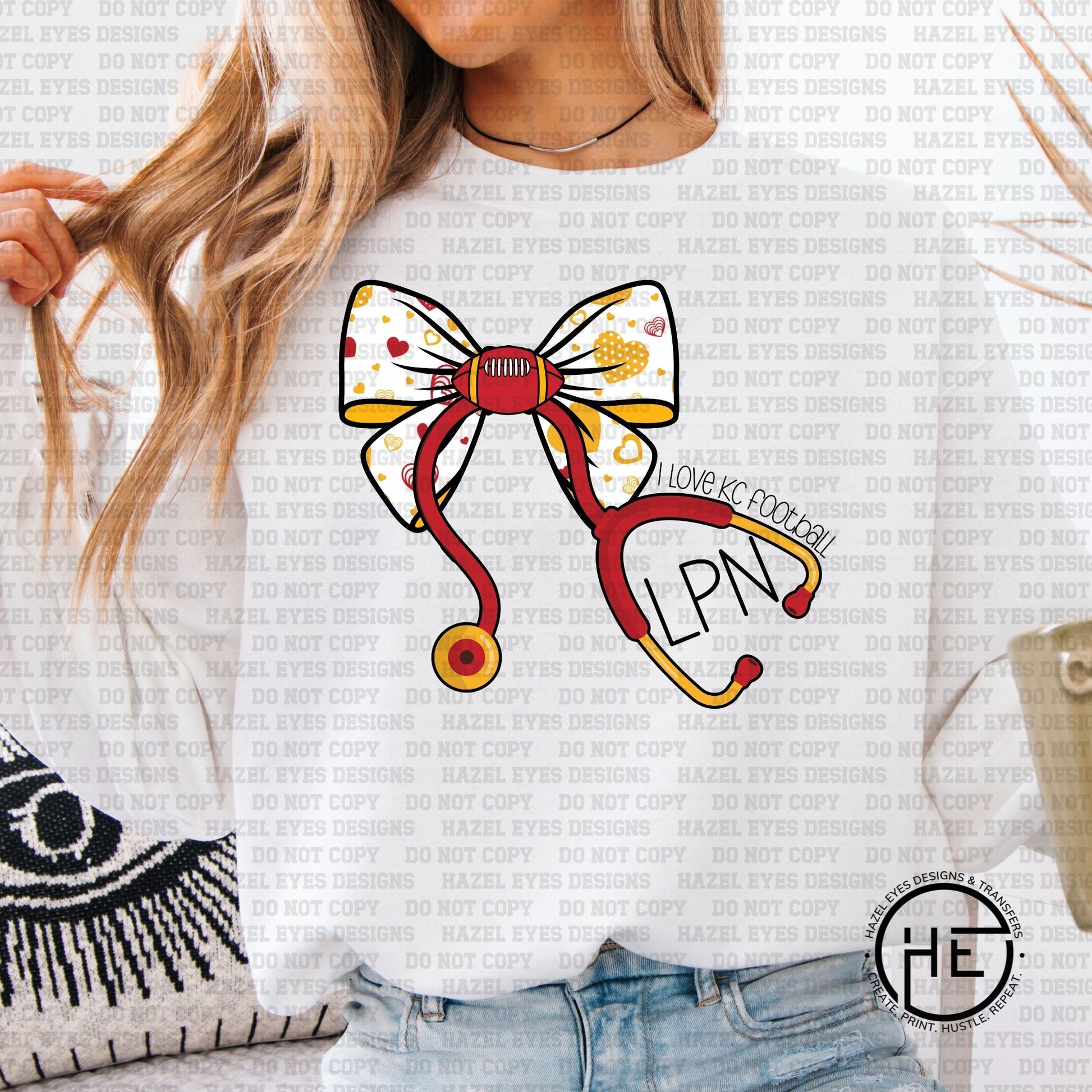 LPN KC Bow DTF This transfer is perfect for creating eye-catching piece and showing your style in a unique & whimsical way. High-quality, durable, and easy to apply, this transfer is ideal for DIY apparel projects.