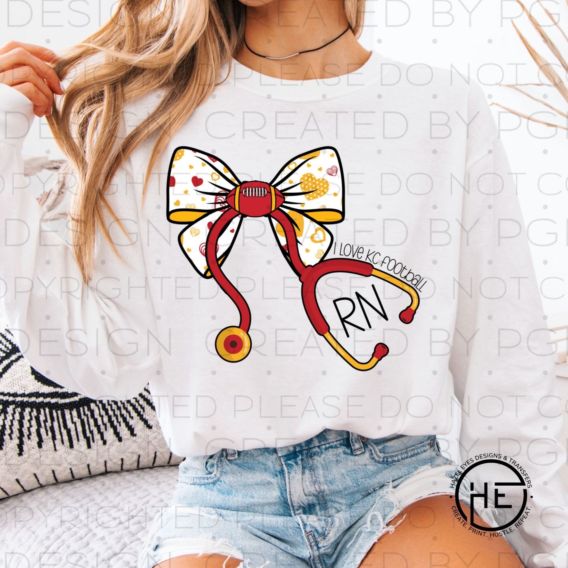 RN KC Bow DTF This transfer is perfect for creating eye-catching piece and showing your style in a unique & whimsical way. High-quality, durable, and easy to apply, this transfer is ideal for DIY apparel projects.