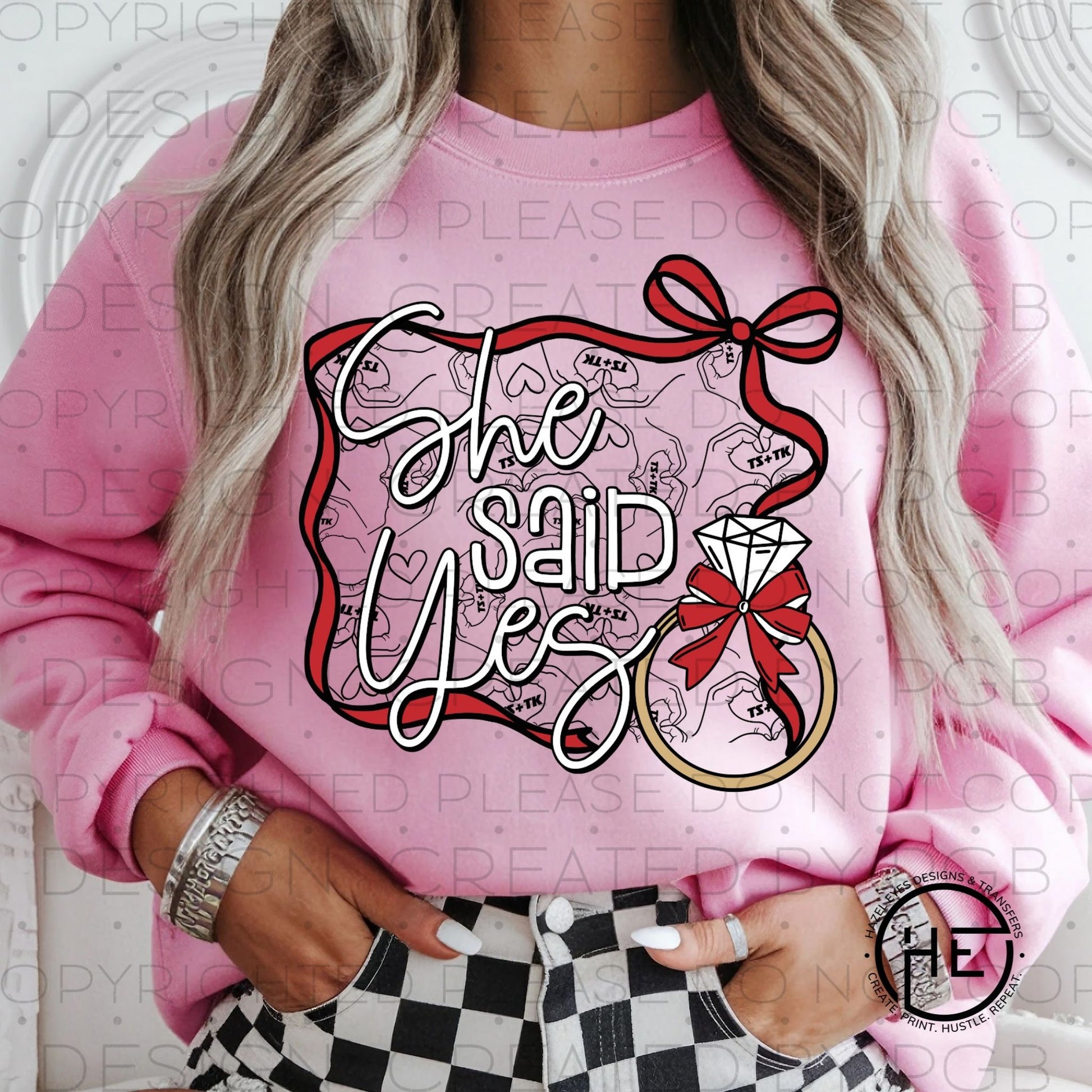 She Said Yes Taylor & Travis DTF This transfer is perfect for creating eye-catching piece and showing your style in a unique & whimsical way. High-quality, durable, and easy to apply, this transfer is ideal for DIY apparel projects.