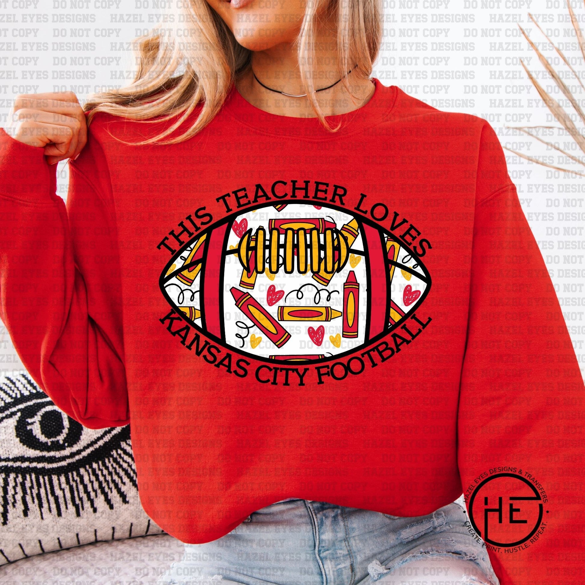 This Teacher Loves KC Football DTF transfer is perfect for creating eye-catching piece and showing your style in a unique & whimsical way. High-quality, durable, and easy to apply, this transfer is ideal for DIY apparel projects.